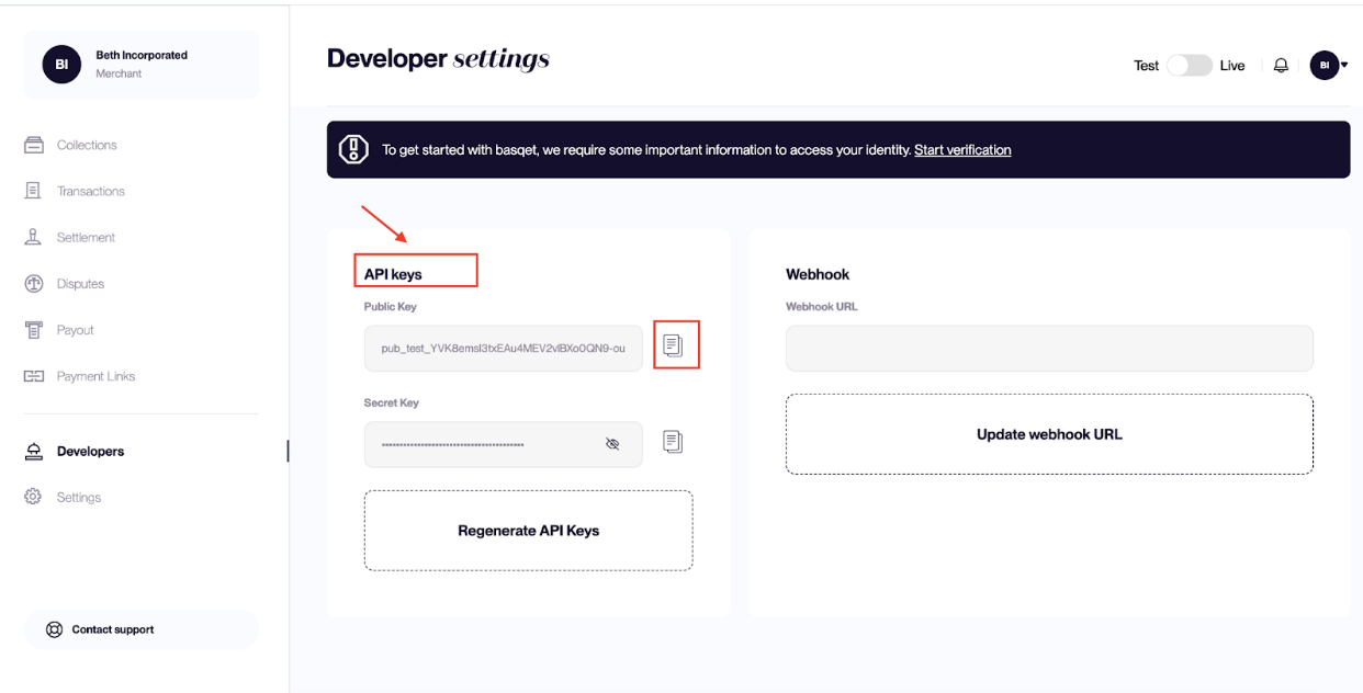 ⚠️ Note: Each environment (e.g., Test, Production) has its own set of API keys. Make sure you use the keys corresponding to the correct environment.