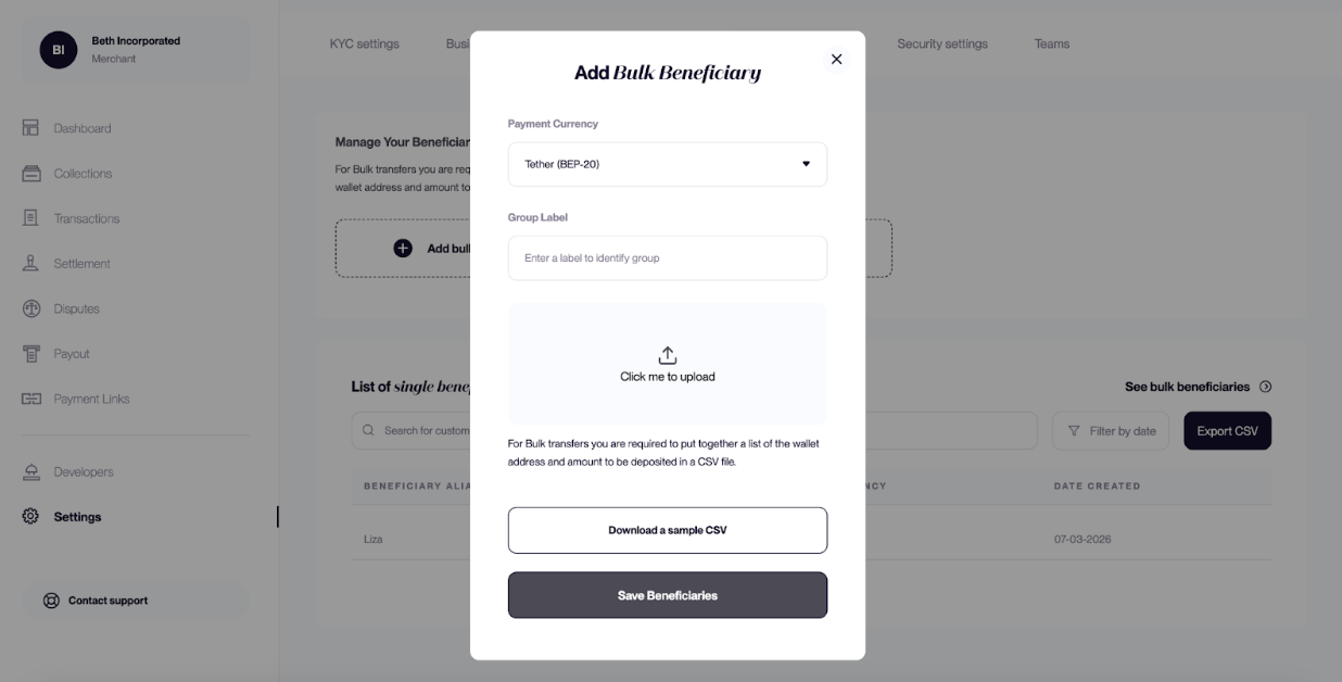 Bulk upload allows you to add multiple beneficiaries at once using a CSV file.