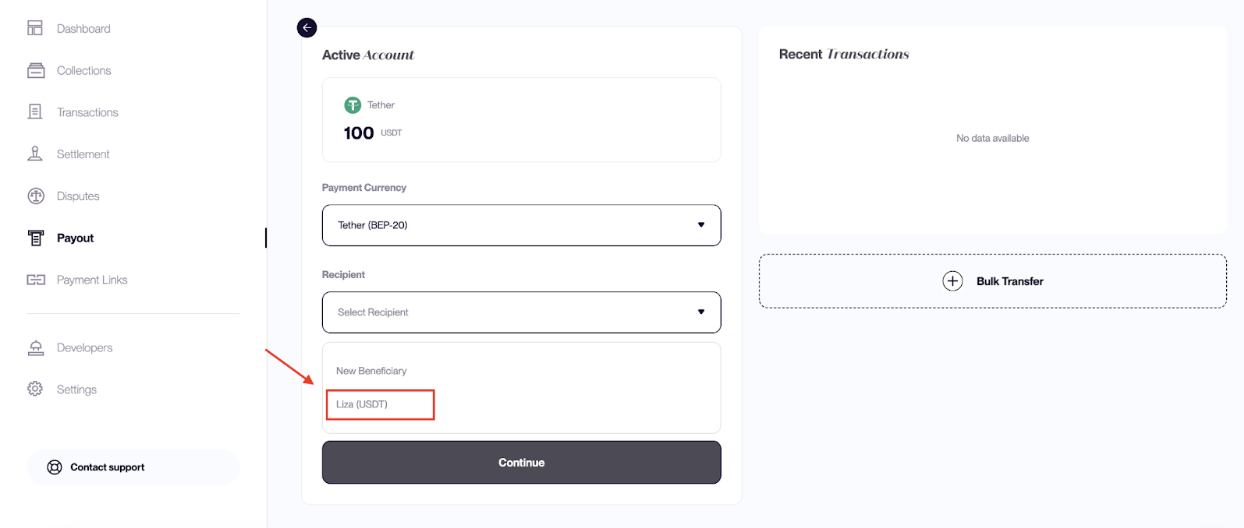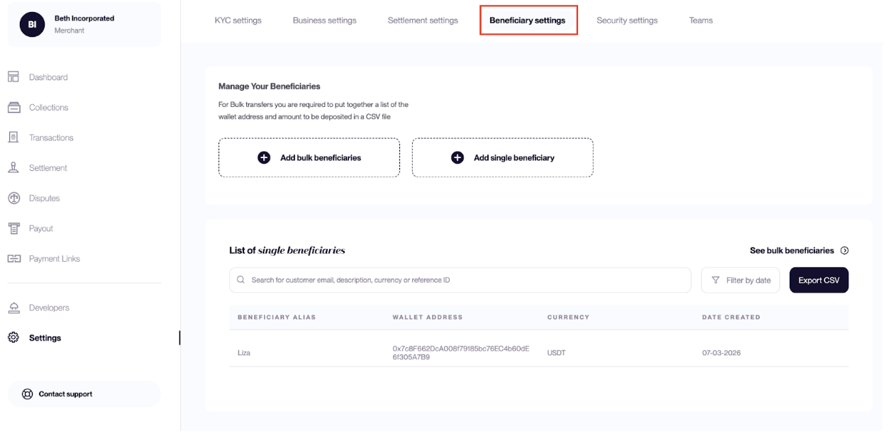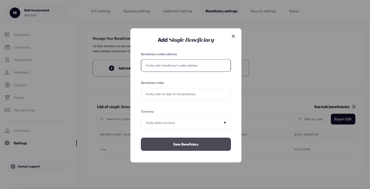Saved beneficiaries can then be selected as recipients when initiating single or bulk payouts.