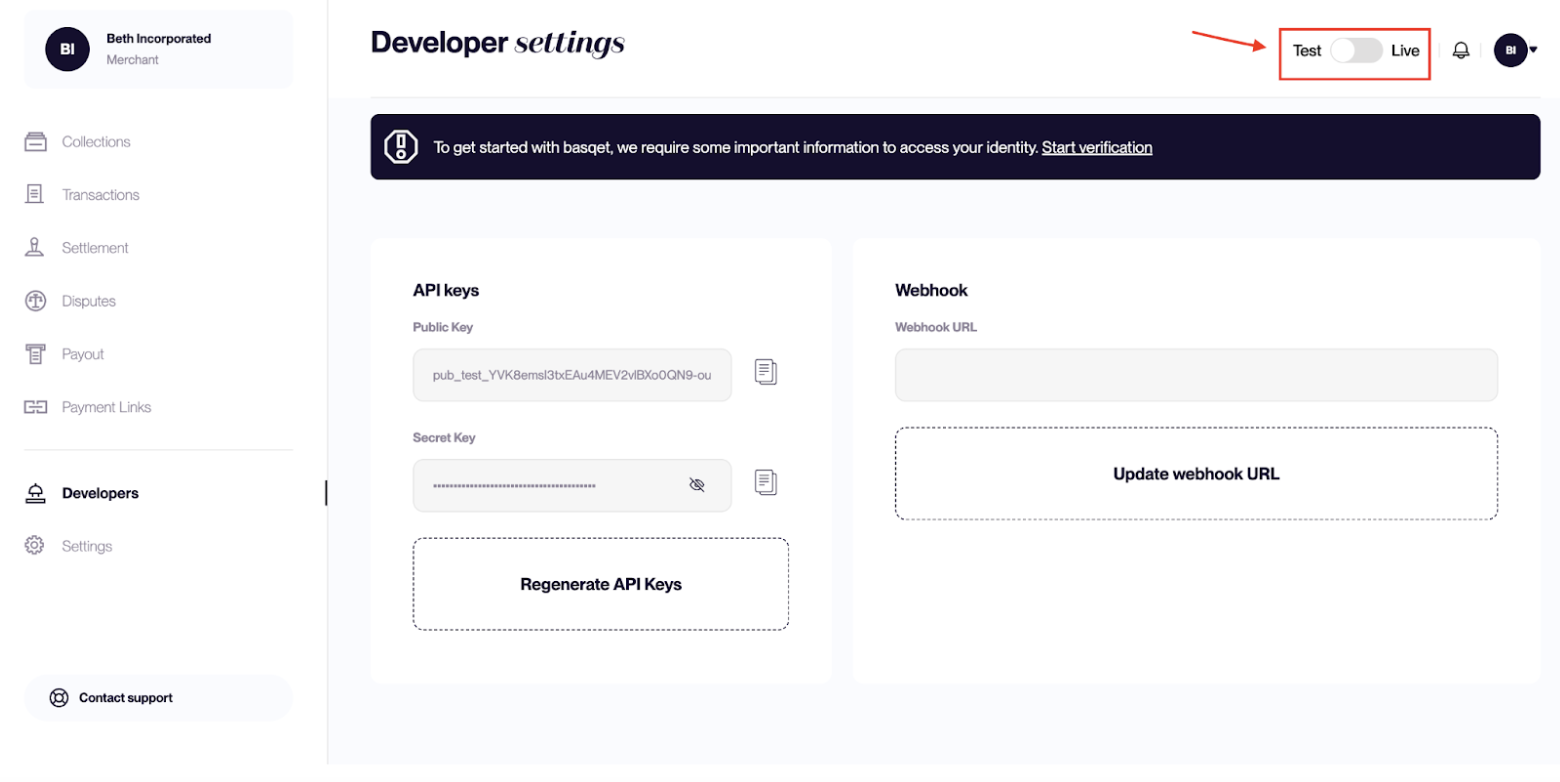 You can switch between Test and Live modes directly from your Basqet dashboard.