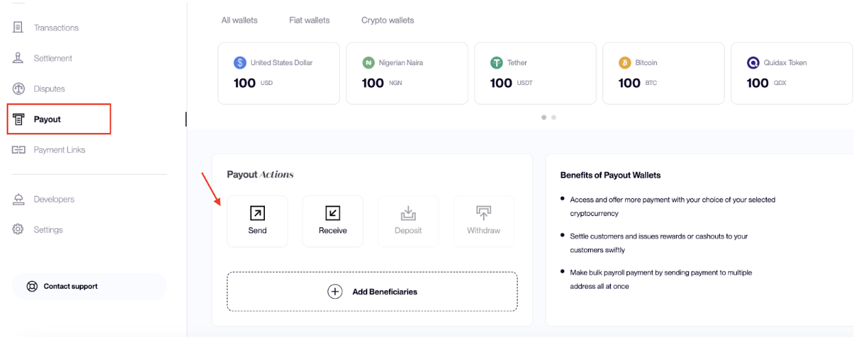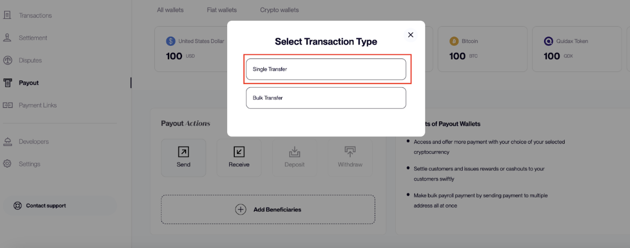 Payouts allow you to send cryptocurrency from your Basqet account to external wallet addresses. You can send funds to a single recipient or multiple recipients depending on your payout needs.