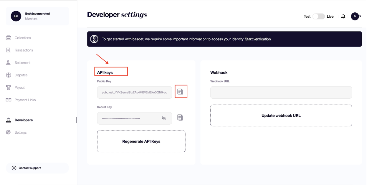 Each environment has its own set of API keys. During development, always use your Test keys.