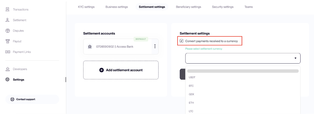 If your settlement currency is set to NGN, all incoming payments will automatically be converted to Naira (NGN) before settlement.